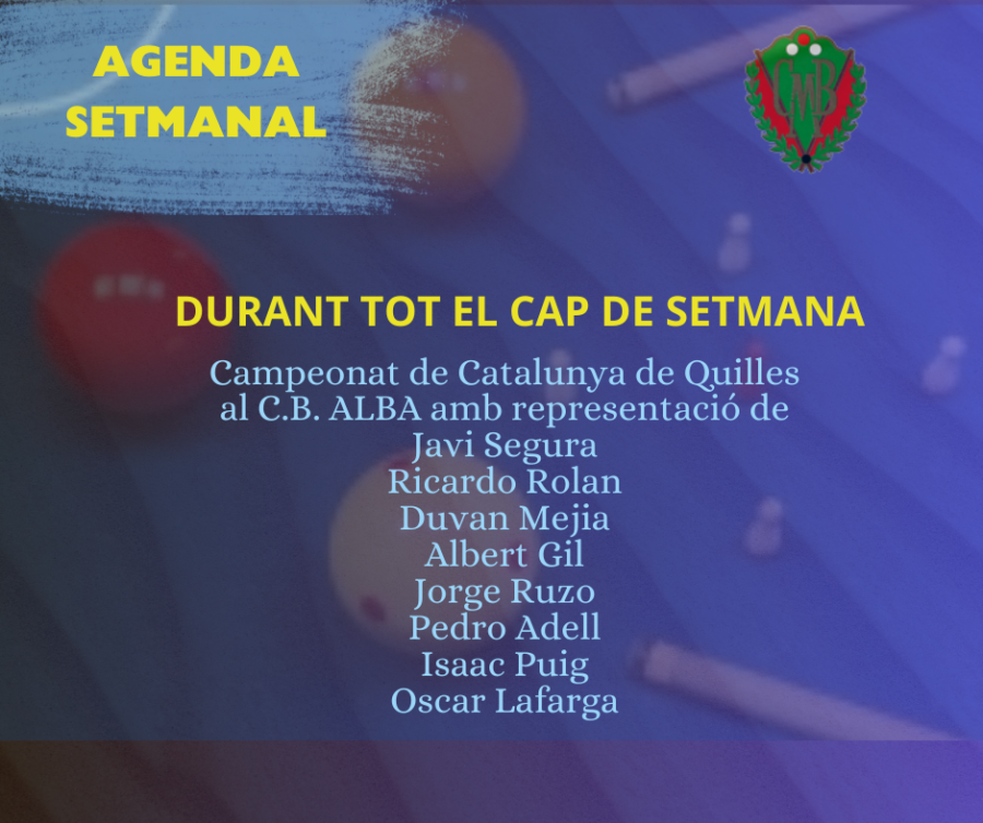 Agenda SetmanaDesitgem sort als nostres companys que participen en el Campionat de Catalunya de 5 Quilles. Por Isaac Puig|2024-02-22T07:31:17+00:00febrero 22nd, 2024|Noticias| Artículos relacionados Agenda Setmanal del 25 al 27 octubre octubre 22nd, 2024 | Sin comentarios Nova lliga de 5 Quilles en marxa octubre 17th, 2024 | Sin comentarios Ja tenim Campions del Social a 3 Bandes a SETS octubre 16th, 2024 | Sin comentarios Agenda Setmanal septiembre 26th, 2024 | Sin comentarios Campionat Catalunya 5 QUILLES septiembre 24th, 2024 | Sin comentarios